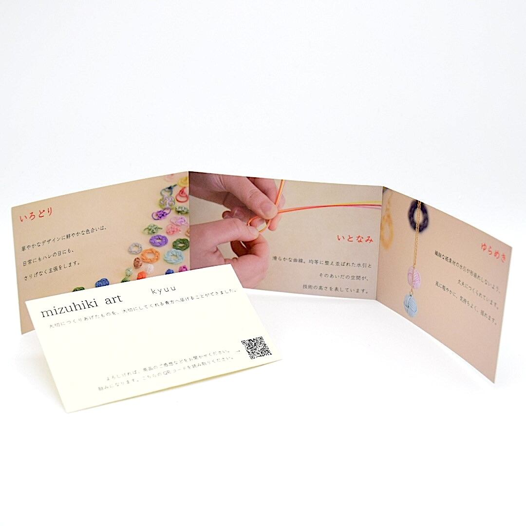 中には、ブランドの解説が記載された3つ折りの冊子と、水引の結びの解説のカードがあります。カードの裏はメッセージが書き込めるようになっています。